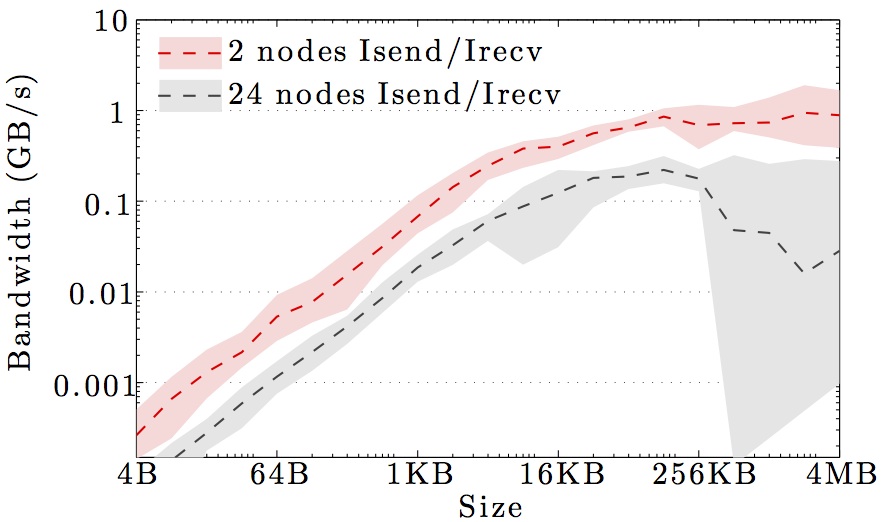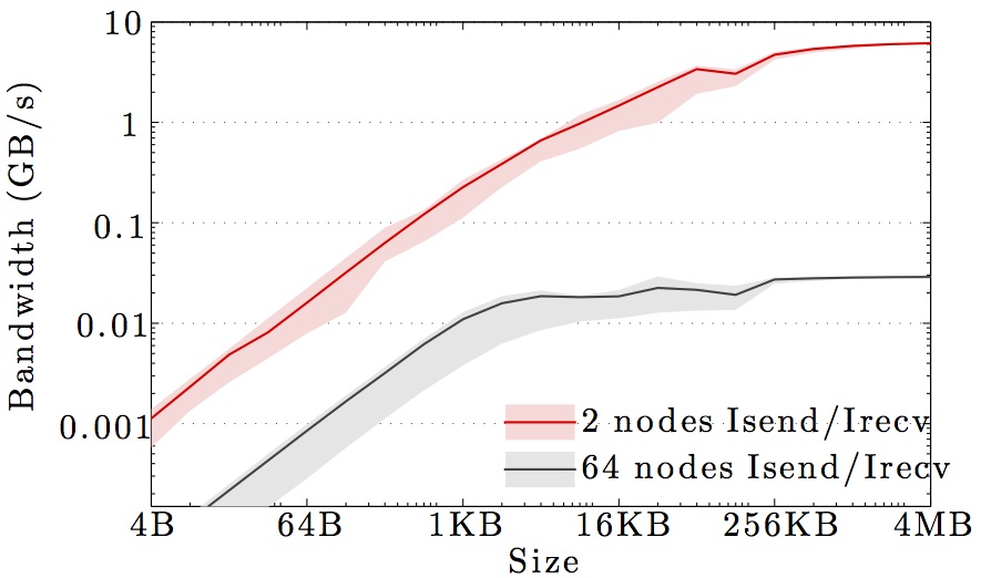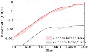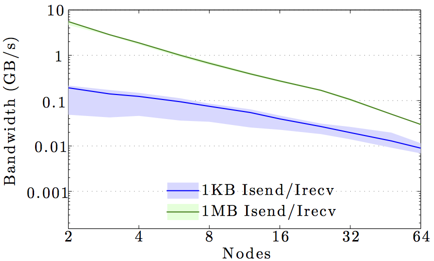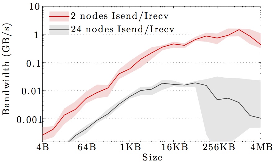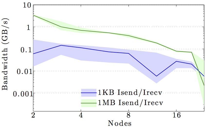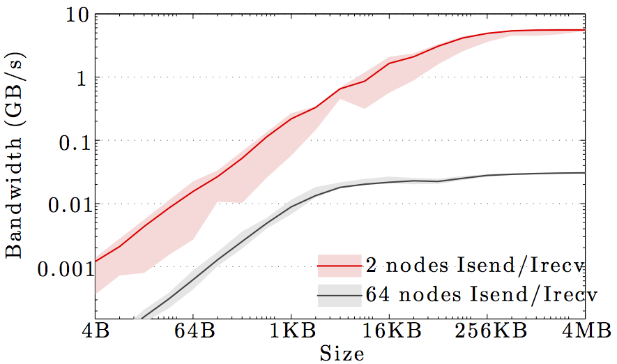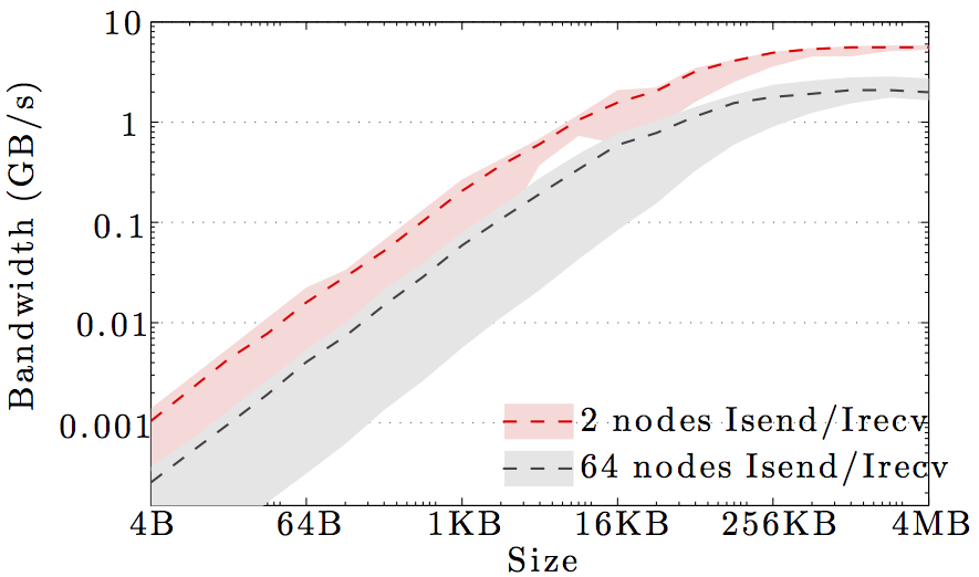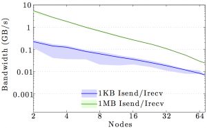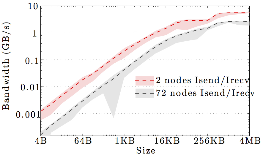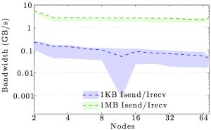 Note the logarithmic axes. Please also keep in mind that the shown behavior depends heavily on the current load on the cluster apart from the particular settings, wiring, and make of the infiniband cards.