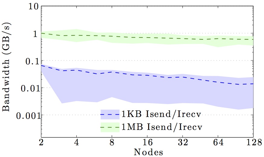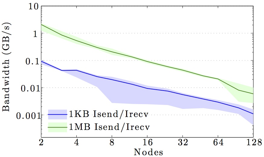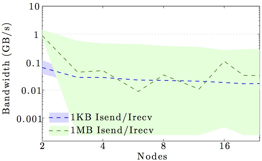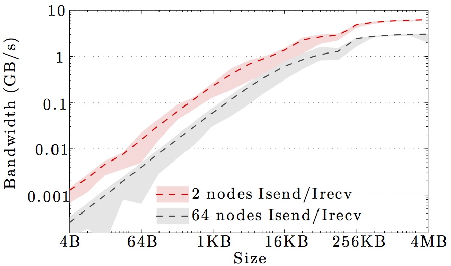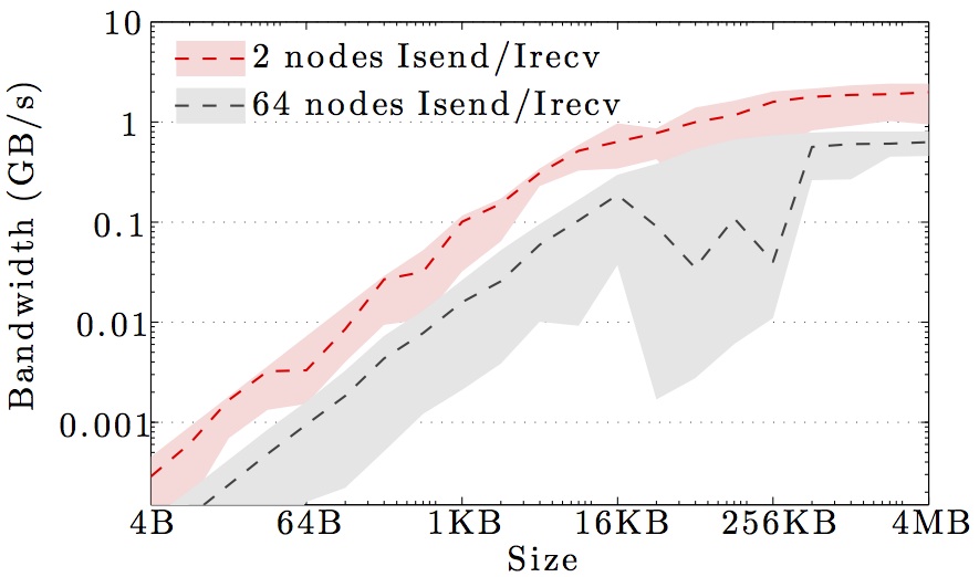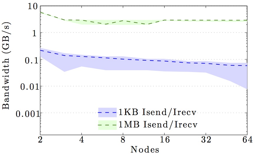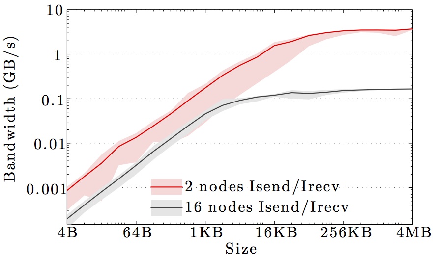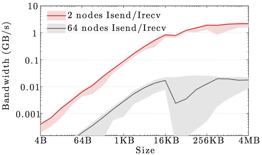Note the logarithmic axes. Please also keep in mind that the shown behavior depends heavily on the current load on the cluster apart from the particular settings, wiring, and make of the infiniband cards.